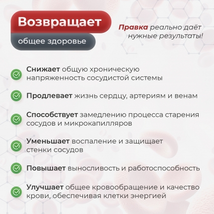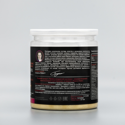 Продукт нацелен на питание и укрепление сосудов, их внутреннее очищение, регенерацию клеток, помощь в самовосстановлении сердечно-сосудистой системы. Катализатор жизненно важных процессов в организме. Обеспечивает сильное кардиотоническое действие, снабжает сердце энергией, защищает и поддерживает его стабильную работу. Рекомендован при лечении атеросклероза, варикоза, тромбоза, профилактики инсульта и инфаркта, для улучшения общего кровообращения.