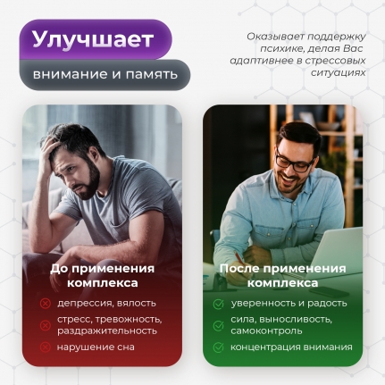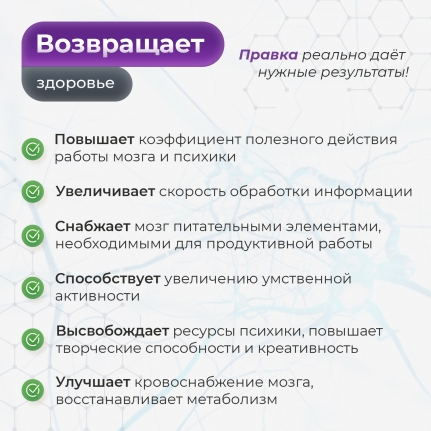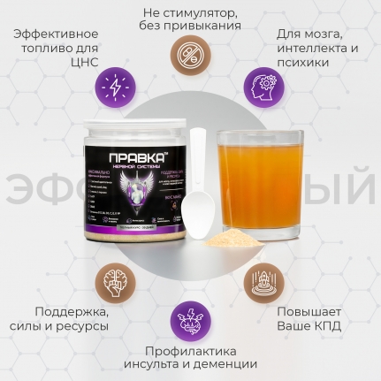 Мощная и многогранная формула для повышения КПД работы интеллекта и гармонизации психики. Снабжает нервные клетки питательными элементами, необходимыми для их эффективной работы. Способствует улучшению памяти и внимания, увеличению умственной продуктивности, повышает настроение. Снижает уровень стресса, напряженности и тревожности. Высвобождает ресурсы психики, повышает творческие способности и креативность. Рекомендован при повышенных умственных нагрузках, дефиците энергии, депрессии.