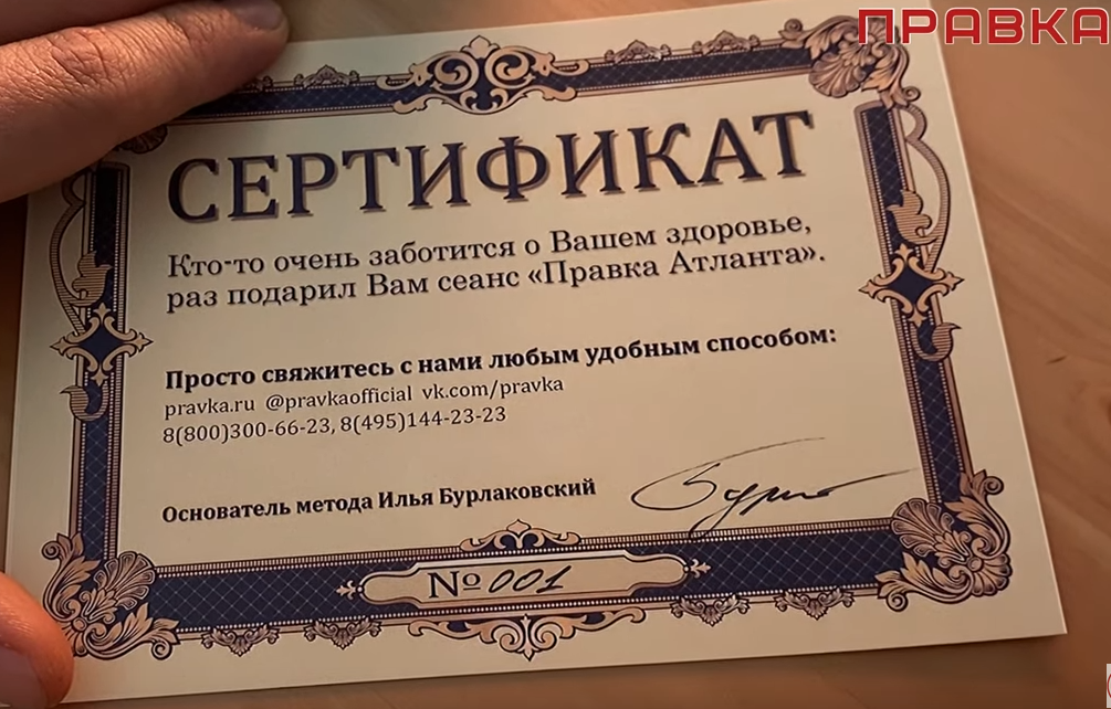 Жизнь бесценна! Если Вы искренне желаете своим близким здоровья, то подарите им сертификат на прохождение сеанса «Правка Атланта», продлите им жизнь и улучшите её качество! Творите волшебство! Мы оперативно осуществим доставку Сертификата в любой уголок Планеты. Уточняйте стоимость и условия у наших администраторов.